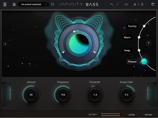 The Listen button solos the affected portion of your source so you can dial in exactly what Infinity Bass is adding to your sound.